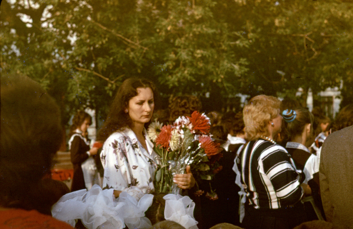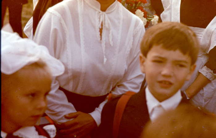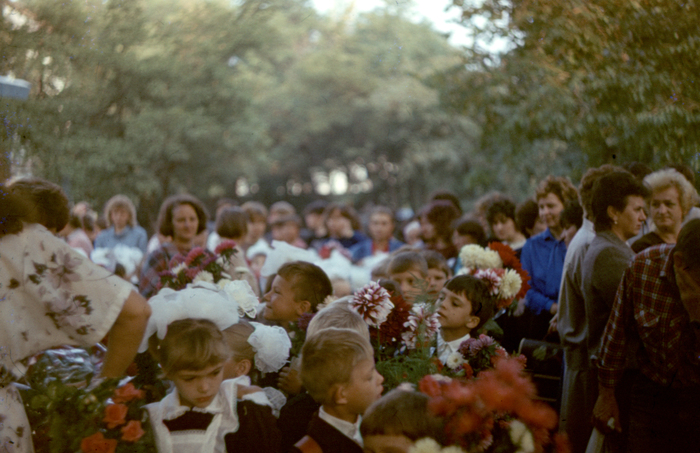 Нууууу, пошла волна. Мои 5 копеек. 1988. Первое сентября. Всё в наличии. Первоклассник с домашней стрижкой. Новенький костюмчик из синей шерсти с погонами, шевроном и алюминиевыми пуговицами. Букет хризантем (?) в целофане. Ранец из коричневого кожзама с хоккеистом и застежкой с кнопкой, выданный в детском саду. Мама с заряженой в Зенит-19 слайдовой пленкой, частенько не попадающая в фокусировку. [Стыд] На ногах непонятные белые босоножки с носками, добытые в магазине в борьбе с дефицитом и растущей ногой [/Стыд]. А дальше всё как у всех. Линейка. Первая учительница, несущая охапку букетов и свежепокрашенные парты. Алла Викторовна, как Вы там?