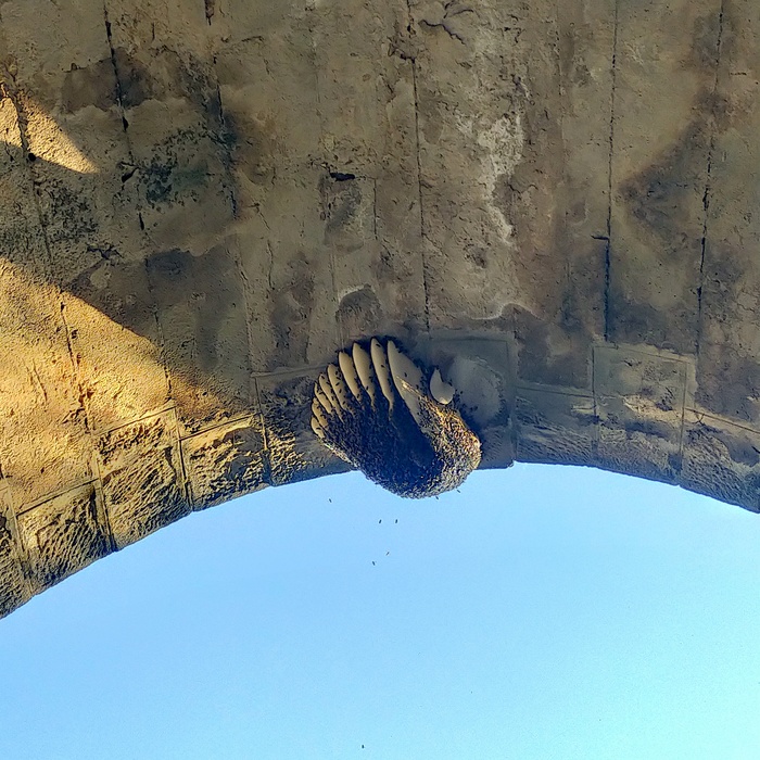 Конструкция довольно монументальна. Высота свода визуально больше 6 метров. На "замковом камне" вытесан символ скрещенных молотка и разводного ключа и год постройки. А ниже - неожиданный сюрприз. На КдПВ явно видно живой пчелиный улей в открытом виде. Всё шевелится и жужжжит. Полагаю, пчеловод, находящийся где-то не очень далеко, не успел стряхнуть новую пчелосемью во время роения. И она улетела искать новое пристанище.