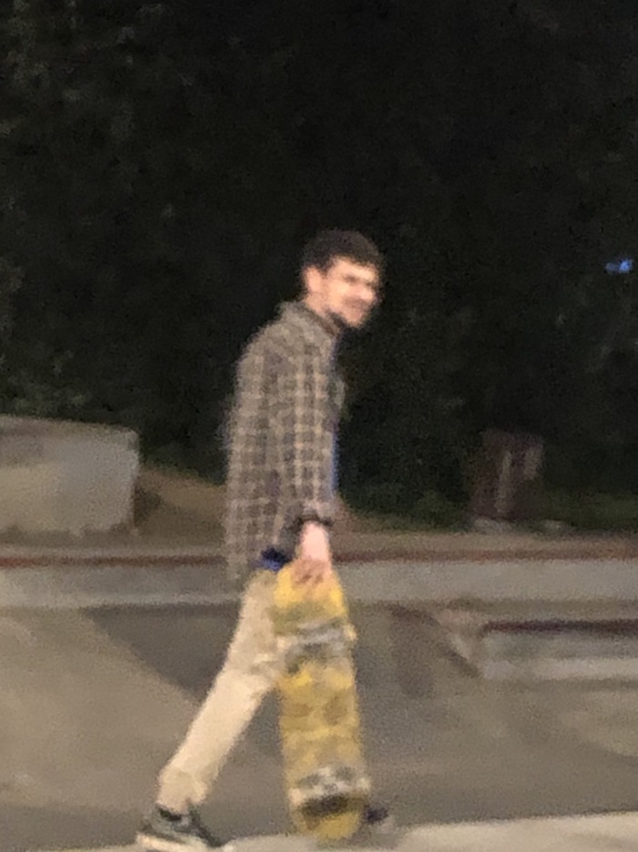 Ладно, думаю я, начинаю уезжать с друзьями из парка, как тут со спины он срывает с меня бейсболку и уезжает в другой конец скейт-парка, видимо думает что я поеду за нее бороться)