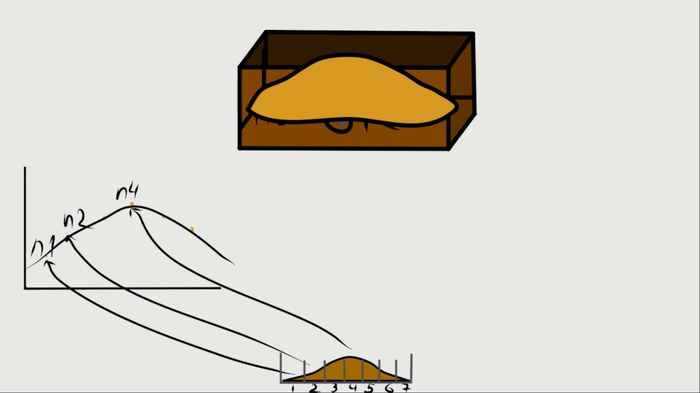 С частицами всё очень просто, для того чтобы представить как они пролетают сквозь прорезь и что за картинка, просто представьте коробку с песком внизу у которой обычная дырка ну или прорезь. Песчинки под действием силы тяжести сыплются сквозь эту прорезь, а внизу мы поставим тазик, у которого будет множество отделений. Ну а после мы просто посчитаем количество песчинок в каждом отделении. На основании этого количества мы построим график. Вот и всё, получим горку и в тазике и на графике.
