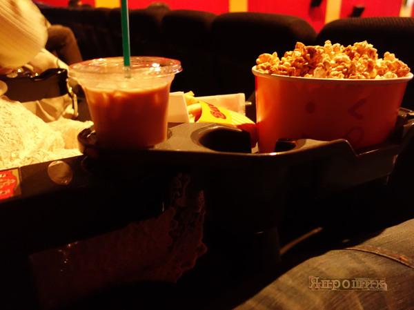 В японском кинотеатре при покупке перекуса дают такой поднос - его можно закрепить на подлокотнике стула. Сюда помещается довольно много разной вкуснятины. Не знаю, есть ли у нас такое, но ни разу не видел.