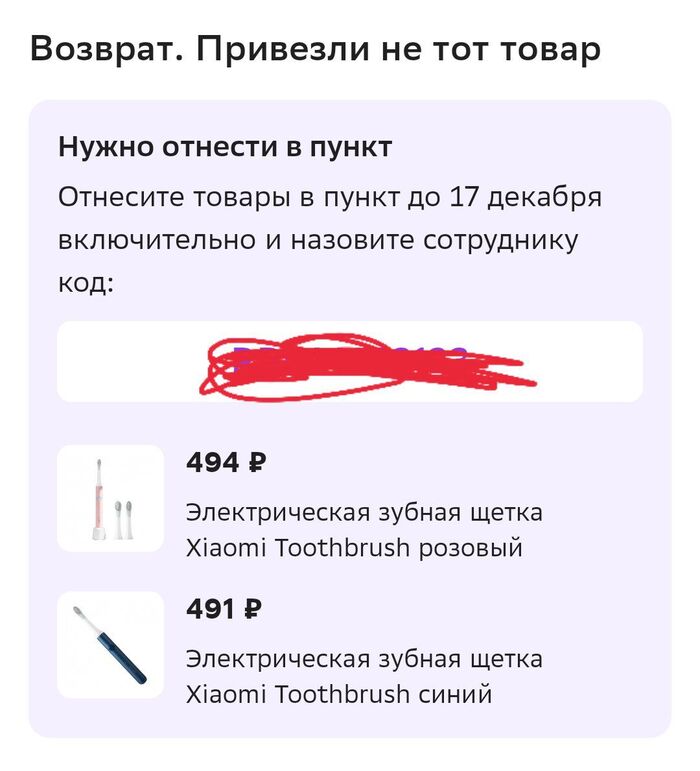 Произошла такая ситуация, заказал я 2 зубные электрические щётки на сбермегамаркете, а вместо них пришла Новогодняя тарелка за 100 рублей, в результате при попытке оформить возврат, мне в пункте приёма говорят что не могут принять тарелку так как у вас в заявке на возврат указаны зубные щётки, и в пункте приёма (Сбербанке) просто разводят руками и ничего не могут сделать. Кто нибудь с этим сталкивался? Что делать?