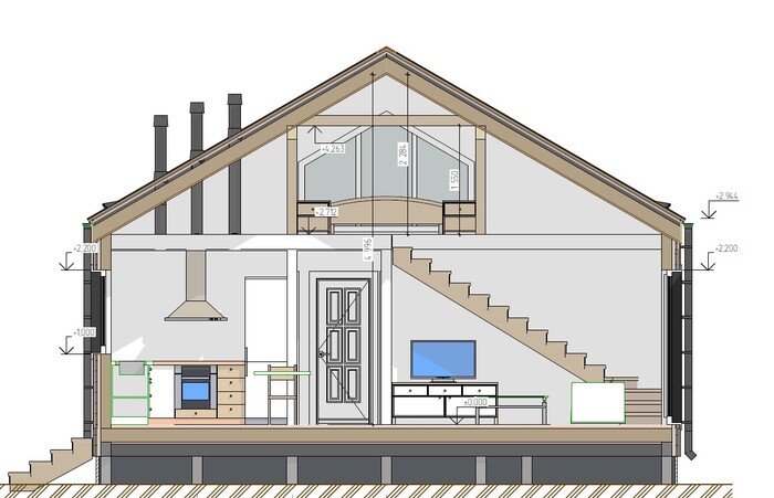 Внутренняя отделка также крашенная на заводе имитация бруса на стенах и вагонка штиль на потолке в зоне второго света кухни-гостиной, на полу фанера 18 мм. В санузлах и техническом помещении черновой пол листы ЦСП, на стенах влагостойкий гипсокартон.