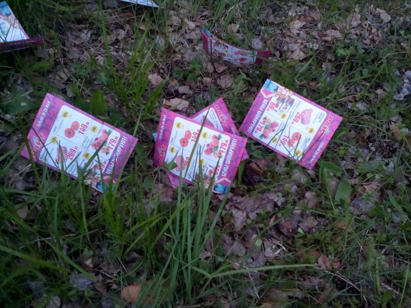 Сегодня гуляя по Основинскому парку (Екатеринбург, Пионерка) нашли с молодым человеком листовки из магазина Райт. Они были разбросаны в чистом месте, где гуляют дети, мамы с колясками.