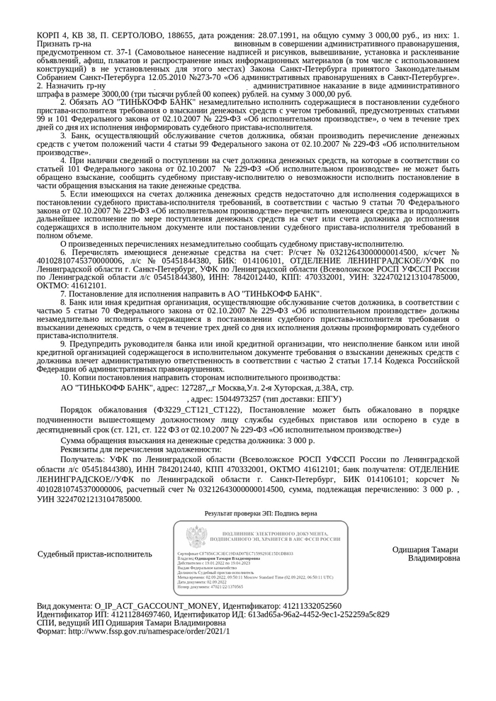 получил на госуслугах уведомление о штрафе за расклеивание объявлений в Санкт-Петербурге. в постановлении все данные указаны мои (верно) , кроме номера счёта банка и адреса проживания (скорее всего из-за адреса никаких больше уведомлений и не было).