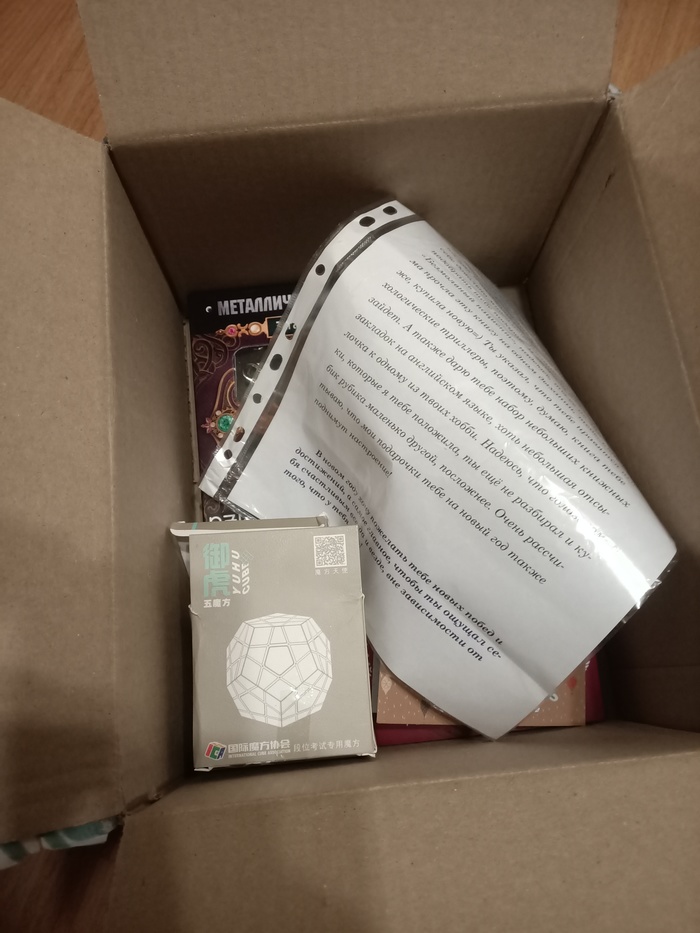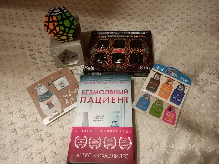 Вау! Были учтены все пожелания, и отправлено именно то, что я люблю больше всего - головоломки, а также крутой детектив (со слов отправителя - он правда крутой, и подаренные закладки отлично его дополняют). В новогодней открытке таинственно спряталась шоколадка и красивый почерк Санты :)