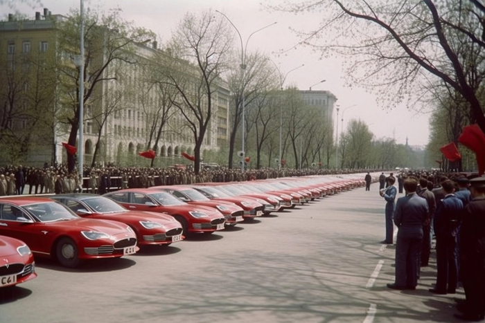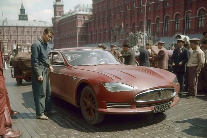 Сейчас по интернету ходит куча подобных изображений, но мне почему-то запомнились именно эти. Тут нейросеть изобрализа ситуацию если бы Илон Маск родился в СССР и как бы это повлияло на наш автопром