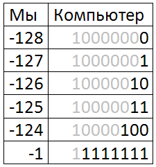 Выделенные серым цветом ноли показаны лишь для того, чтобы вы помнили - в компьютерном представлении эти ноли существуют. Таким образом в памяти компьютера сохранены числа от 0 до 127 (итого 128 разных чисел). Отрицательные числа (первая ячейка принимает значение 1) считаются аналогично, только отправной точкой считается -128. От -128 до -1 также 128 разных чисел.
