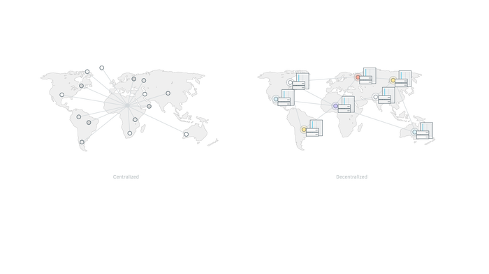 Децентрализованная сеть состоит из одноранговых узлов, которые могут работать независимо друг от друга. Мощность передачи информации распределяется между сетью серверов, а не из одного первичного источника.