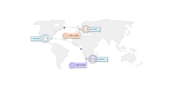 Выданный кредит может быть отправлен и получен людьми в сети, у Stellar есть обменный пункт, который позволит вам отправить EUR имея USD, обмен происходит по самому выгодному курсу на момент перевода.