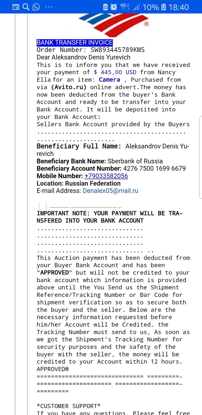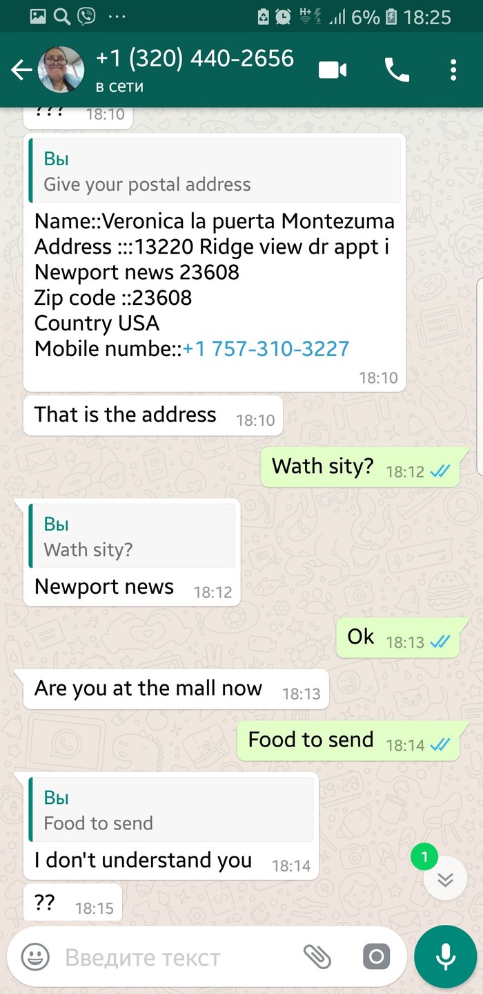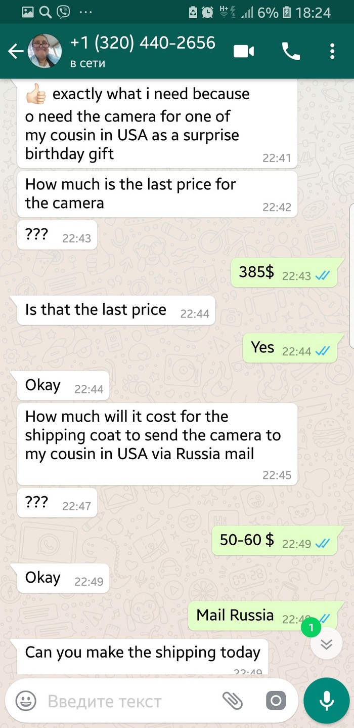 Выложил на одном из ресурсе по продажам обьявление о продаже зеркалки. Через некотое время в ватсап пишет некая женщина на английском, что мол зовут меня Ненси, я в Бельгии и хочу купить камеру для своей племянницы в США. Ясен красен что развод, но было интересно чем все закончится.