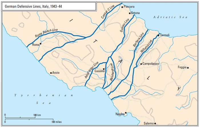 Первый штурм линии 17 января — 11 февраля 1944 г., когда три британские дивизии X корпуса атаковали через реку Гаригилано недалеко от западного побережья, а три дивизии пятой армии США атаковали Кассино, окончился неудачно. Союзники понесли очень большие потери.