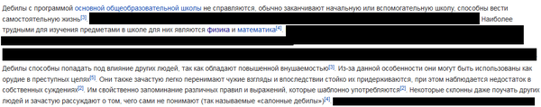 6 huiiiiii Дебильность, имбецильность, идиотия 9 лет назад Читаю я тут статейки по разным степеням умственной отсталости и почему-то вспоминаю некоторых знакомых. Сами почитайте.1) Дебилизм: 2) Имбецильность: 3) Идиотия Википедия Статья
