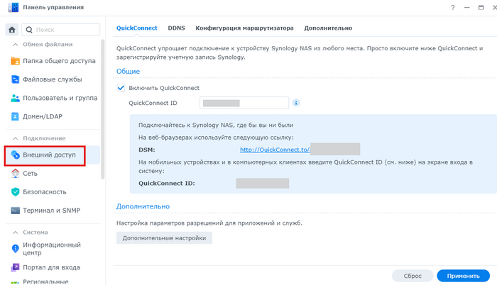 Далее создаем внешний доступ через QuickConnect. Заходим в панель управления/внешний доступ и находим галочку «Включить QuickConnect». Ставим свой ID и пробуем подключиться через ссылку, которую он сгенерирует. Насколько я знаю, там даже статического IP не нужно, но у меня он есть.