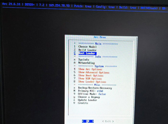 Важный момент: чтобы у вас работали все облачные функции synology типа quickconnect, то перед началом установки нужно активировать патч в установщике ARC (в главном меню установки перед выбором модели нужно сначала найти в меню (где-то с 4 по 8 пункт, к сожалению, не нашел скриншота с ним) и нажать decrypt arc patchи вбить код, который по-хорошему вы должны найти в discord, в канале ARC loader, но актуальный для версии 24.7.5 я выложу сюда LMF453. Сверху должно быть написано Patch: true