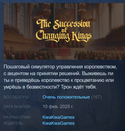 Я тут увидел пост Бесплатно, то есть даром и последующий Результаты раздачи The Succession of Changing Kings, в которых автор игры раздавал бесплатно ключи к игре в Стиме. Сперва я зашел в стим и увидел, что у игры более 90%+ рейтинг при более 160 отзывах, т.е. раздают не совсем уж шлак.