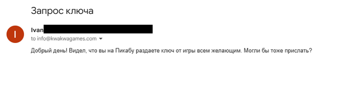 Поскольку в детстве меня родители учили, что бесплатный сыр бывает только в мышеловке и в таких ситуациях 99% кто-то хочет тебя наколоть, я решил проверить автора. Уж больно подозрительно в комментариях все восторгались, но я то ли невнимательно смотрел, то ли не увидел ни одного человека, кто сказал бы что получил ключ от автора в итоге. И в итоге написал ему, хотя деньги на покупку игры у меня были.