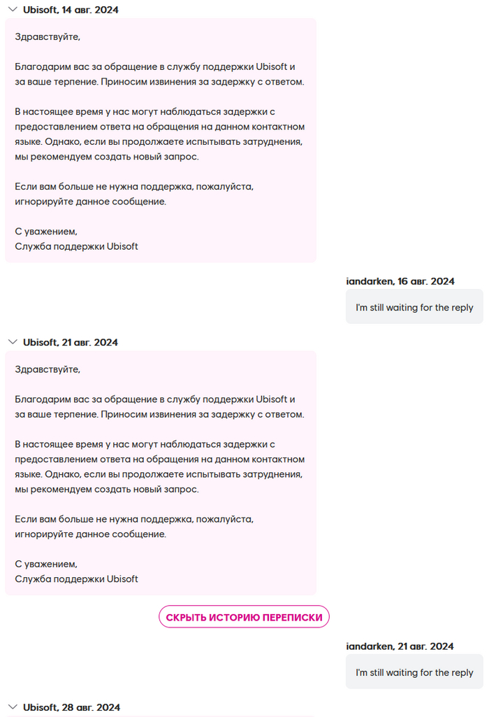 И стало мне интересно - а с чем это связано? В общем, я решил уточнить у техподдержки Убисофт, может это глюк какой? И написал им следующее
