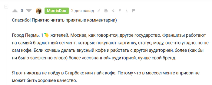 ТС во втором посте указал: "Опять же, я сильно улетевший по фильтру и пытаюсь людям прививать желание пить вкусный черный кофе (без насилия и снобизма)." - Это его личные предпочнения, но к бизнесу это никак не относится. А пост вроде про бизнес.