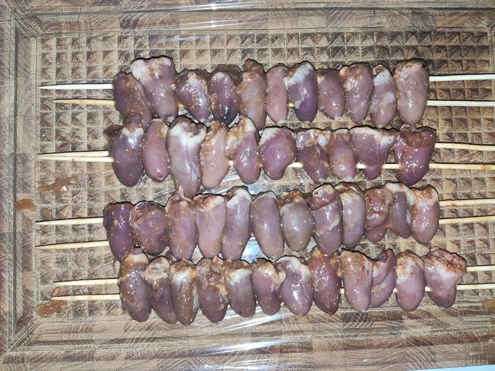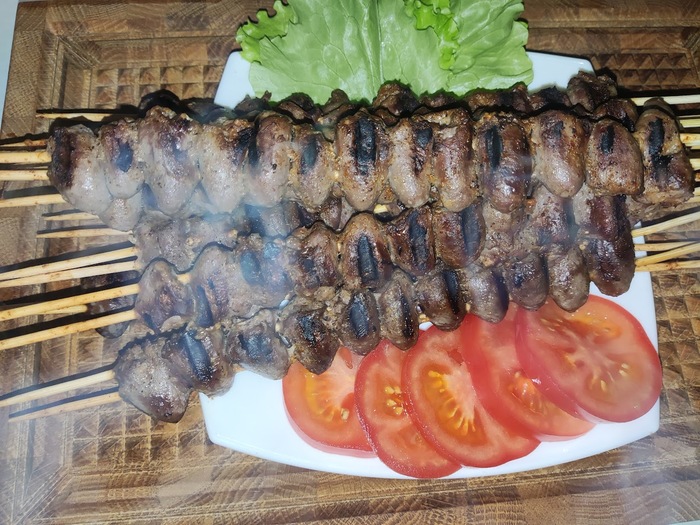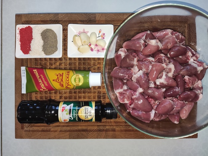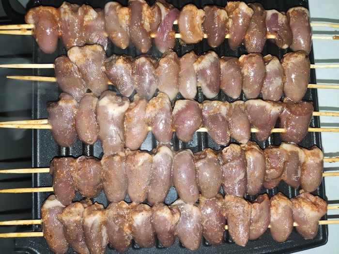 С сердечек удаляем лишний жир и кровь, засыпаем сухими специями (список специй каждый может выбрать сам на свой вкус). Далее делаем маринад, смешиваем соевый соус, горчицу, сахар (можно использовать жидкий мед), свежий чеснок (через пресс) и кунжутное масло. Маринадом заливаем сердечки и даем постоять минут 30-60 (чем больше – тем лучше), после насаживаем сердечки на шпажки и обжариваем на гриле до готовности.