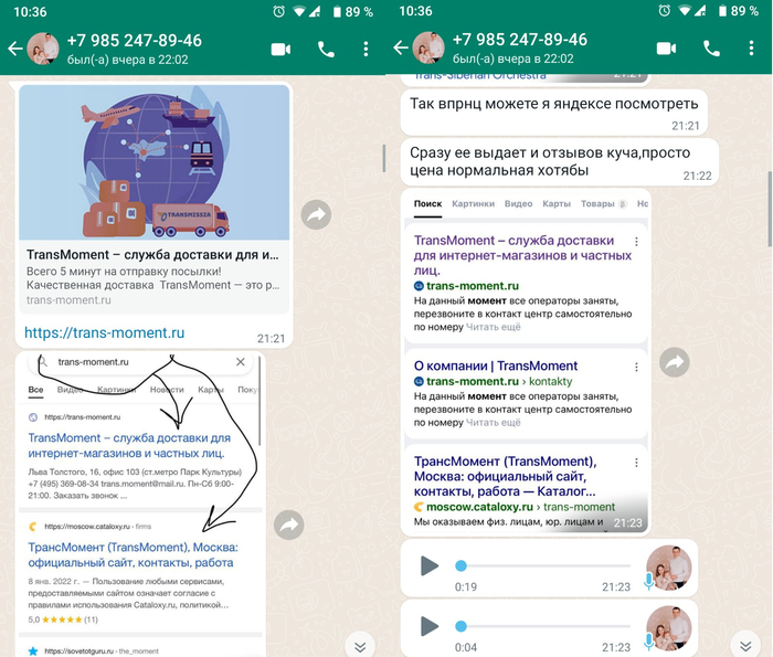 После разговора он присылает мне в вотсап ссылку на сайт ТК и, зачем-то, скрины с Яндекса и Гугла, который доказывают, что эту компанию можно найти в поисковике (с чего это продавцу так дался именно этот "ТрансМомент"?).
