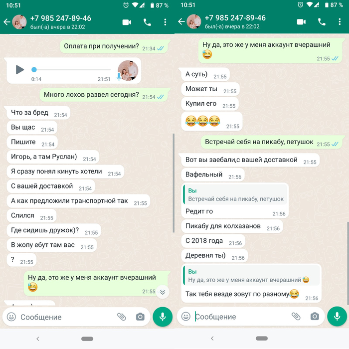 Я набрал номер продавца, но он оказался не абонент. Это был 4-й звоночек. В итоге мы созвонились по вотсапу и продавец начал меня технично уводить от личной встречи и навязывать услуги некоей недорогой транспортной компании "ТрансМомент", у которой также есть формат "безопасная сделка", но при этом низкая цена и быстрая доставка. И вообще все будет в лучшем виде, он готов даже мне прислать видео работы дорожки, чтобы меня успокоить. Весь разговор проходил под фон женского голоса на заднем плане, видимо, чтобы создать у меня иллюзию разговора с семейным человеком. Чтож, хоть и в первый раз слышу о такой ТК (5-й звоночек), но бывает - жене тоже коляску какой-то непонятной ТК отправляли, я ни до, ни после о ней не слышал.