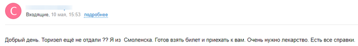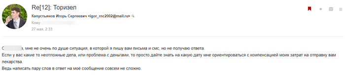Человека совсем не беспокоит что я знаю все его паспортные данные, которые он дал мне для отправки ему лекарство курьерской службой. Знает что больной, в моём состоянии, не будет ради нескольких тысяч дёргаться и искать правды на другом конце России.