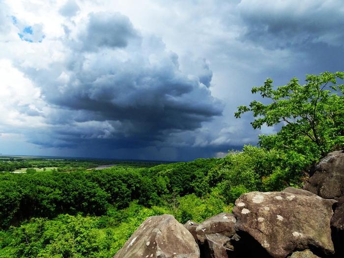 20.06.18г., я как всегда, поехал на потухший вулкан Неогенового периода, "Сенькину шапку" чтобы пофотоохотиться, на змей и других представителей животного макромира. Погода была солнечная, небо всё в кучевых облаках, так что никаких природных неожиданностей не предвиделось. Но не успел я пройти, от места высадки, до подножия шапки, а шёл я медленно (минут 20), так как оглядывал все кусты в поисках своих "моделей", как вдруг, небо в месте моего нахождения, посерело и послышались небольшие раскаты грома. Было очень интересно и неожиданно. Интересно потому, что справа от меня небо было чистое, с белыми кучевыми облаками, а слева от меня и надо мной зависла серая туча. Что там творилось в небесах, мне было не очень хорошо видно, потому что я был под деревьями, но потом стало темнеть и я понял, что что-то намечается. И не ошибся, потому что пошёл довольно неплохой дождь. Мне ничего не оставалось делать, как спрятаться под деревьями и ждать. На моё счастье, туча которая появилась из-за "Сенькиной шапки", не пошла в сторону Севера, откуда я прибыл (тогда бы меня не спасли бы деревья) и где светило солнце, а грохоча потянулась в сторону г. Уссурийска, находящемся на Востоке. На моё счастье, дождик пролил всего минут десять и появилось солнце, которое практически сразу все подсушило. Выйдя из своего укрытия я стал искать своих макромоделей. Единственно кого я не рассчитывал увидеть, так это змей, за которыми я, в основном, и приехал на шапку, потому что дождь, пусть и не большой, заставил их спрятаться. Когда я поднялся на середину каменной гряды и находился уже выше деревьев, под которыми прятался, я смог увидеть всю грозовую тучу, которая направилась в сторону Уссурийска. Сначала туча была как и все грозовые тучи, но в процессе её фотографирования, я увидел, что она начинает трансформироваться и приобретать очертания человеческого лица, с удлинённым носом. У тучи появились - нос, рот, два глаза (один имел даже ресницы). И все это не было хаотично, а складывалось в настоящую человеческую физиономию. Не знаю, как кто, но я такую тучу видел впервые. Именно эти фотографии, я и представляю на Ваш суд. И на последок - змей (Щитомордников), я всё-таки встретил, когда сел перекусить на один из камней. Их я заметил, когда они стали выползать из под моих ног. Мне ничего не оставалось делать, как очень осторожно убрать ноги, чтобы не испугать появившихся аспидов и уже сверху камня сфотографировать одного из них. Так что, мой поход прошёл удачно!!!