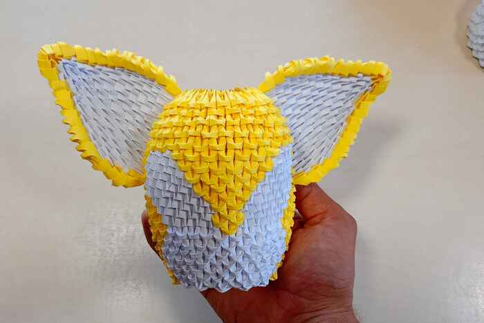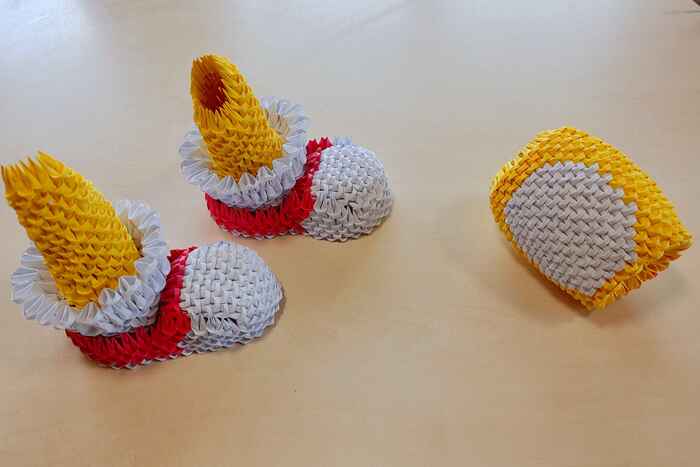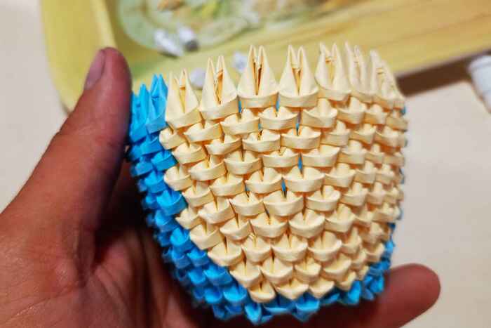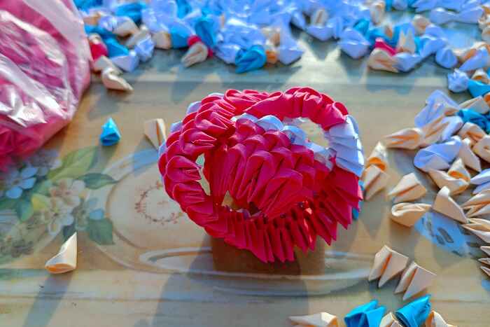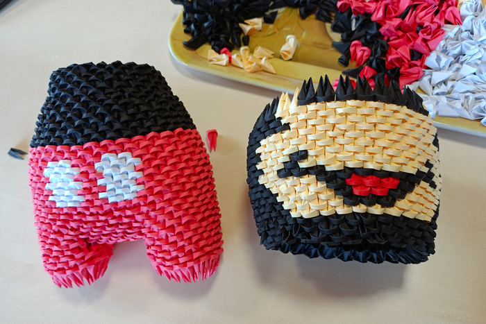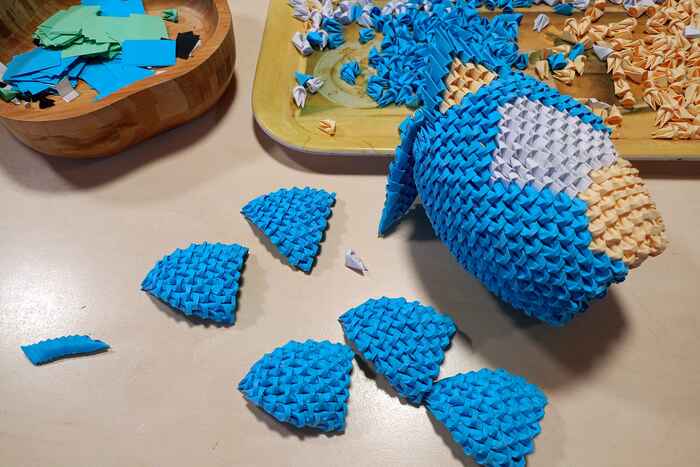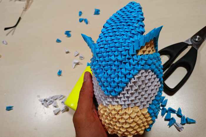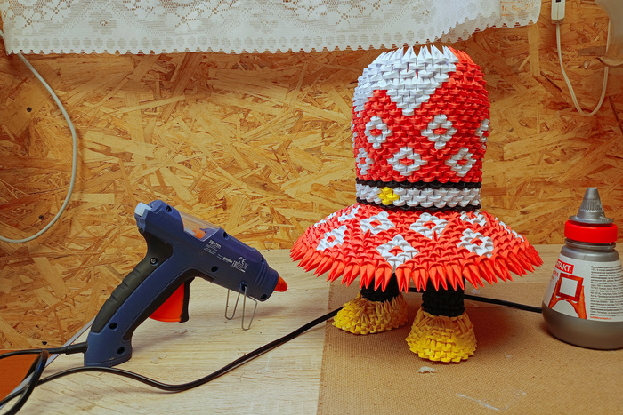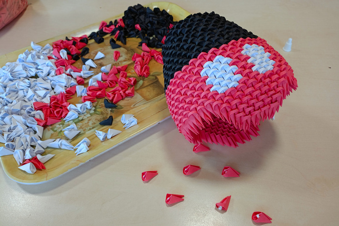 Для создания фигурки пригодится только цветная бумага, ножницы и клей. Все фигурки состоят из одинаковых маленьких деталей, сложенных из бумаги. Для примера я сфотографировал у спичечного коробка один модуль. На складывание одного такого модуля уходит около 25 секунд, далее из сотен таких модулей складывается фигурка.