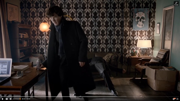Пятый и шестой стоп кадр, приехал Джон, Шерлок сидит с пистолетом.