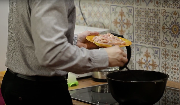 После того как мясо примет белый цвет, забрасывайте шампиньоны.