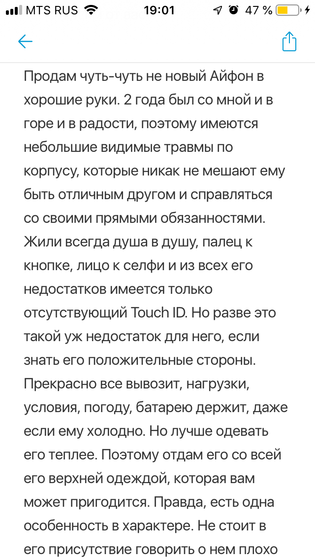 8 ilyacom 7 лет назад Прочитал и прослезился. Мой первый пост. Сильно не пинайте, если что то не так. Показать полностью 2 iPhone Скриншот Авито Девушки Длиннопост
