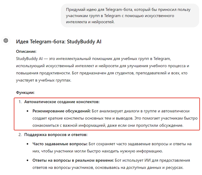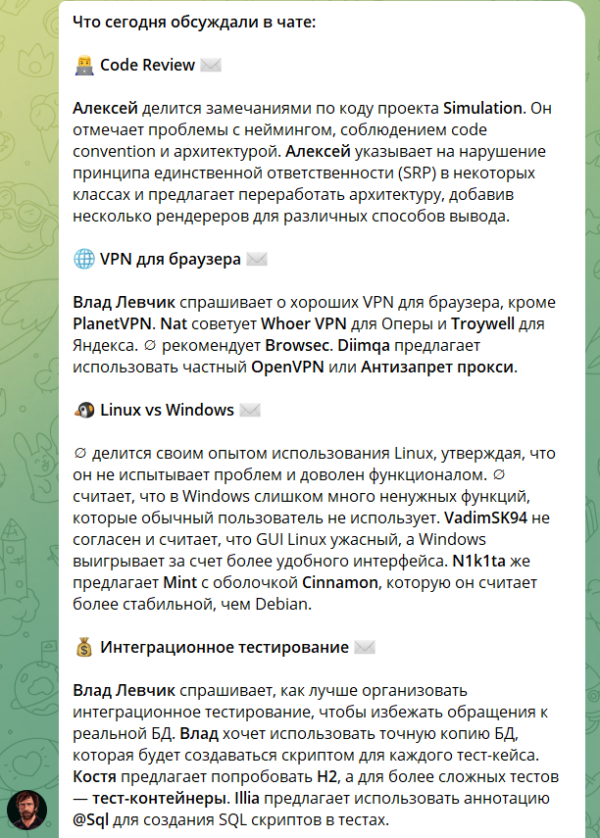 Именно с этой функции все и началось год назад. Создавая бота, я закрывал собственную боль, ведь прочитать краткое изложение сообщений в своем чате на 2000 человек – это всего 2 минуты времени вместо 20-30 минут, если читать полностью все сообщения. Таким образом я стал первым реальным юзером своего же бота и с точки зрения собственного пользовательского опыта, понимал, какого функционала не хватает боту.