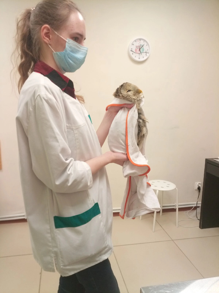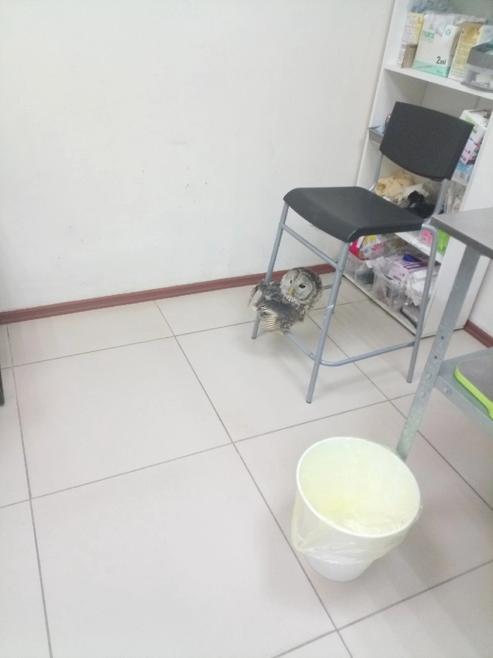Зооспас направил ее к нам и прораб привез сову .Перед этим,оценив масштаб мягкого говоря повреждений, записали ее на экстренный прием в Зооспец на 5 вечера .