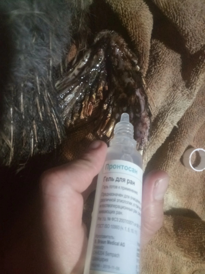 Ожоги на крыле начали засыхать и трескается, соответственно немного кровоточат. Обрабатываем препаратом из нового назначения. Спасибо орнитологу из Мурманска, сделала назначение без инъекций, птичке и так больно.