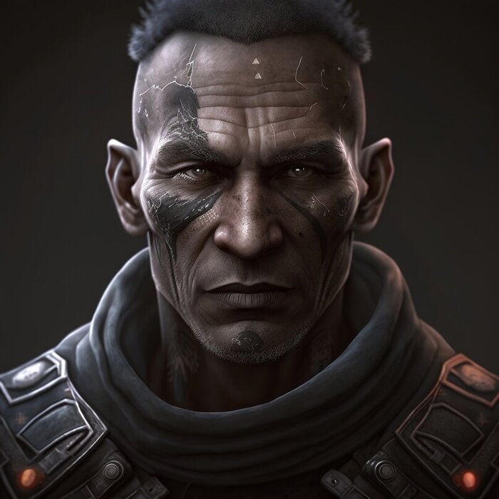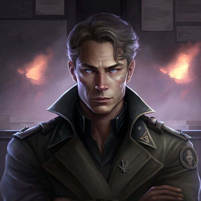 Невероятно накачанный высокий голубоглазый блондин с огромной бородой. 60 лет. Очень начитанный и интеллигентный человек. Категорически не любит стереотип о тупых и сильных Доминионцах. Лучший воин корпуса ближнего боя Инициативы, берсерк.