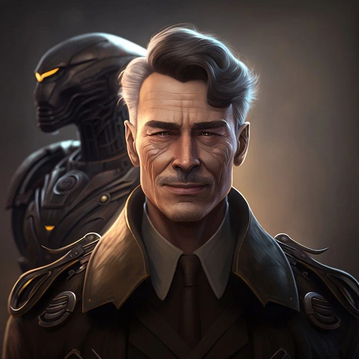 Седой человек в возрасте, что уже крайне заметно, несмотря на активные программы омоложения. Имеет множество механических протезов. 92 года. Обладает чересчур общительной и болтливой натурой, любит обсудить политику, действия лидеров государств, и новости в области робототехники. Имеет три ИИ помощника для деятельности, очень часто уходит в разговор с ними.