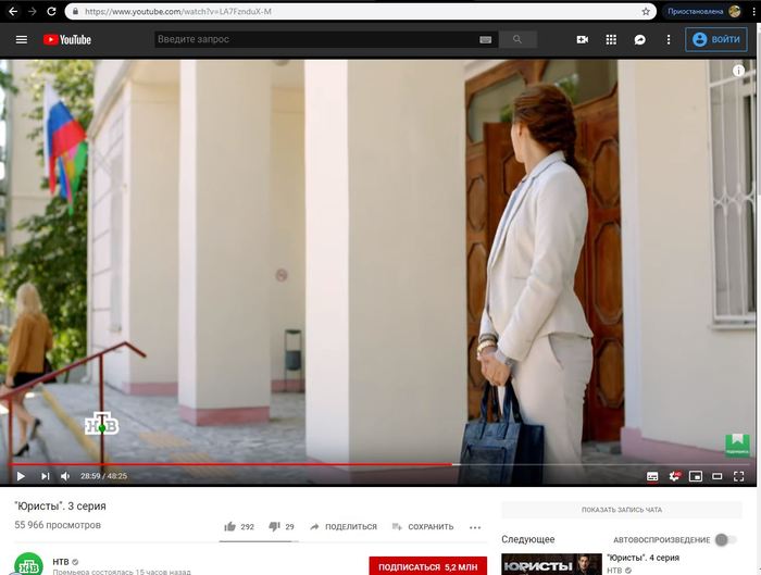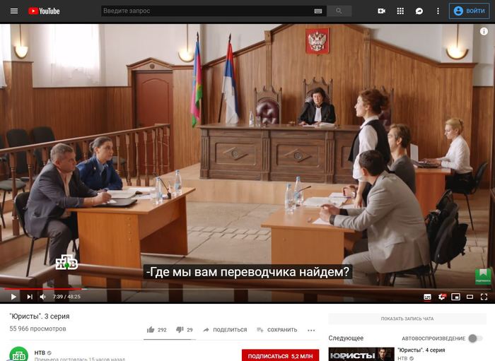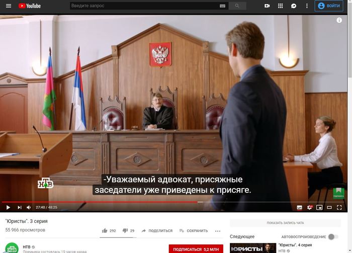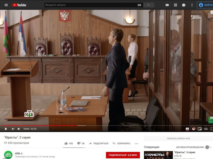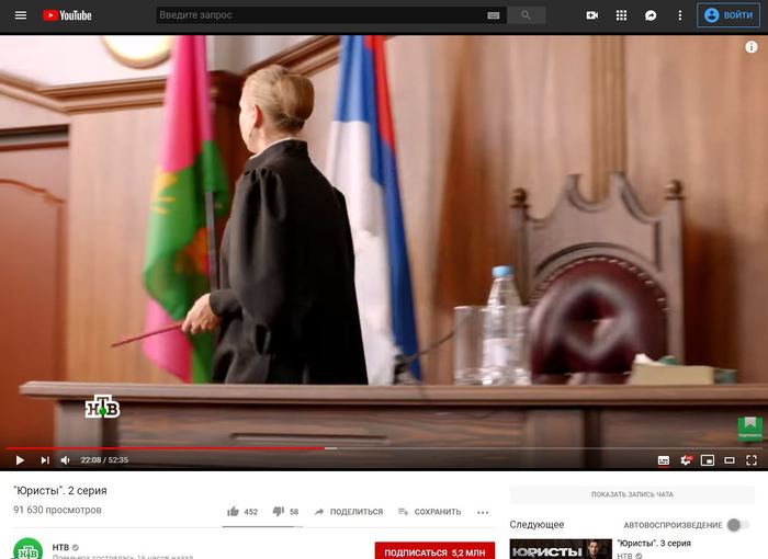 Вечер 3-го мая 2019г. мои родители решили провести за просмотром телевизора, остановив свой выбор на новом российском сериале Юристы, что снял для нас и показывает федеральный телеканал НТВ. История фильма проста: "чёрная полоса в жизни главного героя заставляет его уехать в родной город Геленджик и начать вести дела там". Но история сейчас не об этом, а о том, что все дела рассматриваются в зале суда неизвестного нам государства. Но государства, в котором есть Краснодарский край и город Геленджик. На текущий момент на экране показаны и в сеть выложены первые четыре серии сериала. И все эти серии содержат один и тот же киноляп или сцены Надругательства над Государственным флагом Российской Федерации (если рассматривать со стороны "Оскорбления чувств верующих гражданина РФ). Пробежавшись курсором мыши по тайм-лайну этих 4х серий, я обнаружил СЕМЬ эпизодов, где флаг РФ был установлен неверно.
