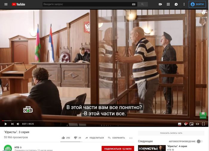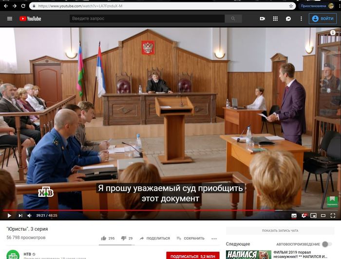 p.s. К чему я вообще это всё: очень, очень обидно, что у нас такое отношение ко всему и во всём. Могу предположить, что стажёр-реквизитчик в сжатые сроки готовил съёмочную площадку, но через "зал суда" по скромным подсчётам прошло более 100 человек: главные герои, массовка, операторы, звукари, быть может и режиссёр сидел в специальном кресле и кричал "Мотор! Снято!" Потом был этап монтажа (наверное), предпросмотр. Эх.