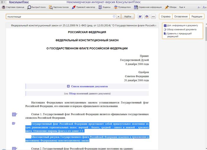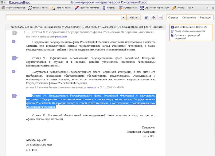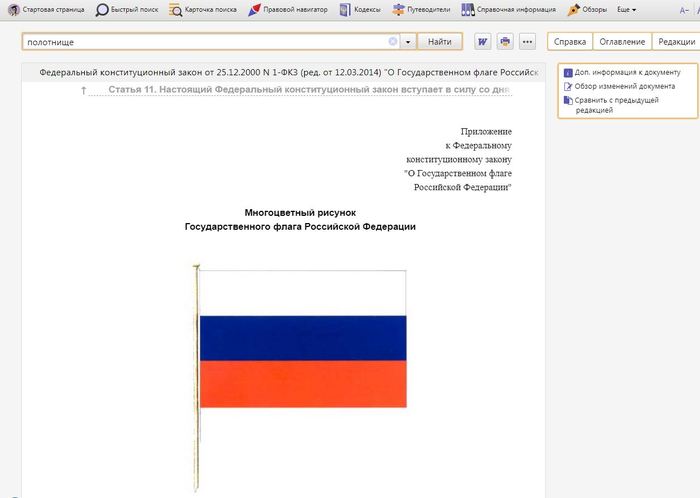 В нашей стране установлен Федеральный конституционный закон от 25.12.2000 N 1-ФКЗ (ред. от 12.03.2014) "О Государственном флаге Российской Федерации" (с изм. и доп., вступ. в силу с 01.09.2014) ( Ссылка на Консультант ), в котором: