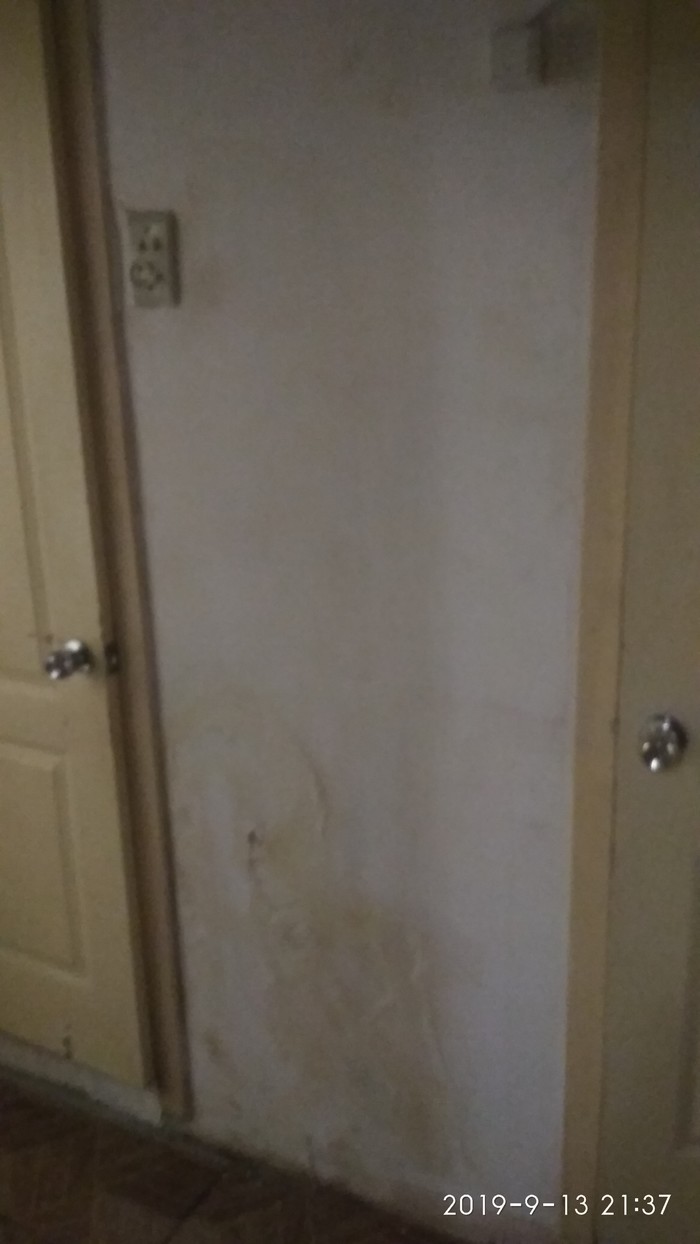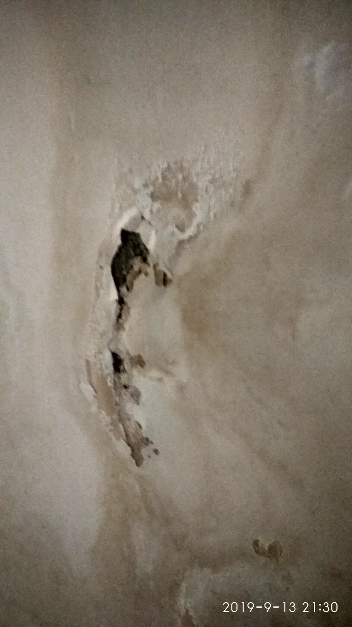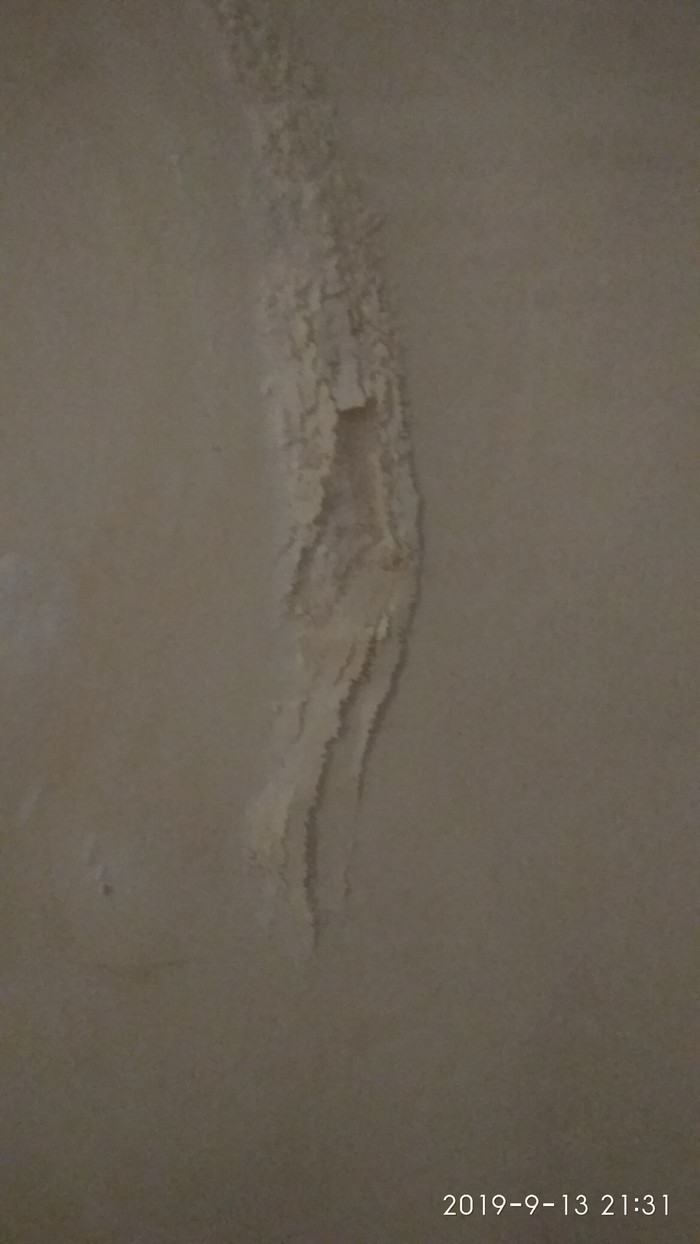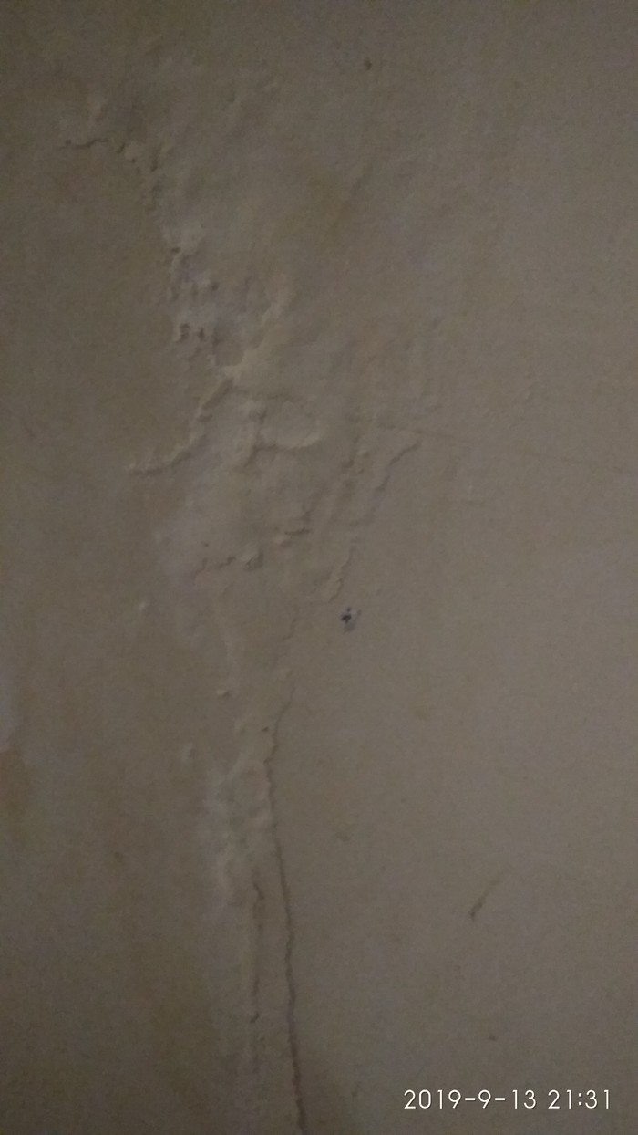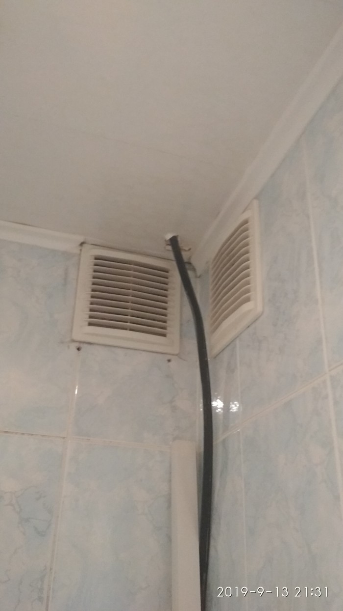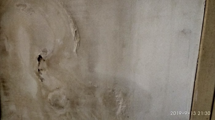 Я заклеил скотчем вытяжку в туалете три года назад, чтобы принудительная вытяжка в ванной не выбрасывала испарение из ванны в туалет. И пол года назад потихоньку началО образовываться то, что видите на фото. Хорошо, что не наклеили обои. Но есть короб стояков.
