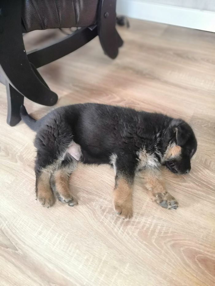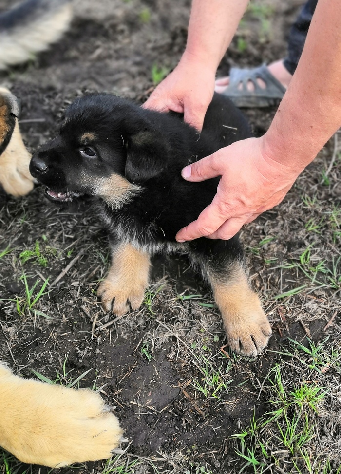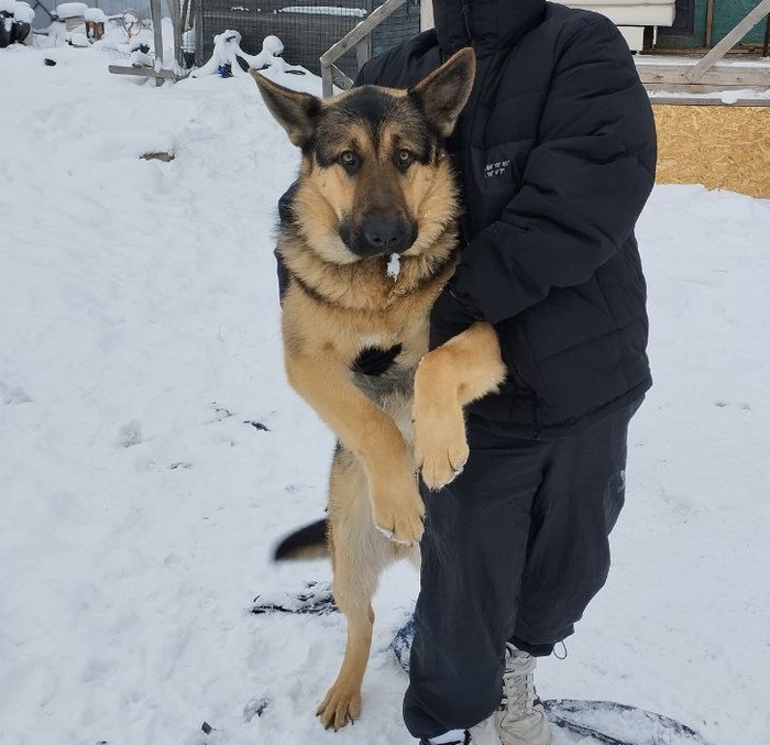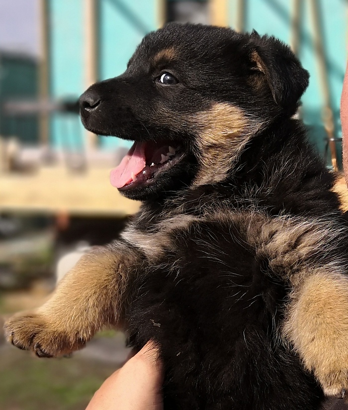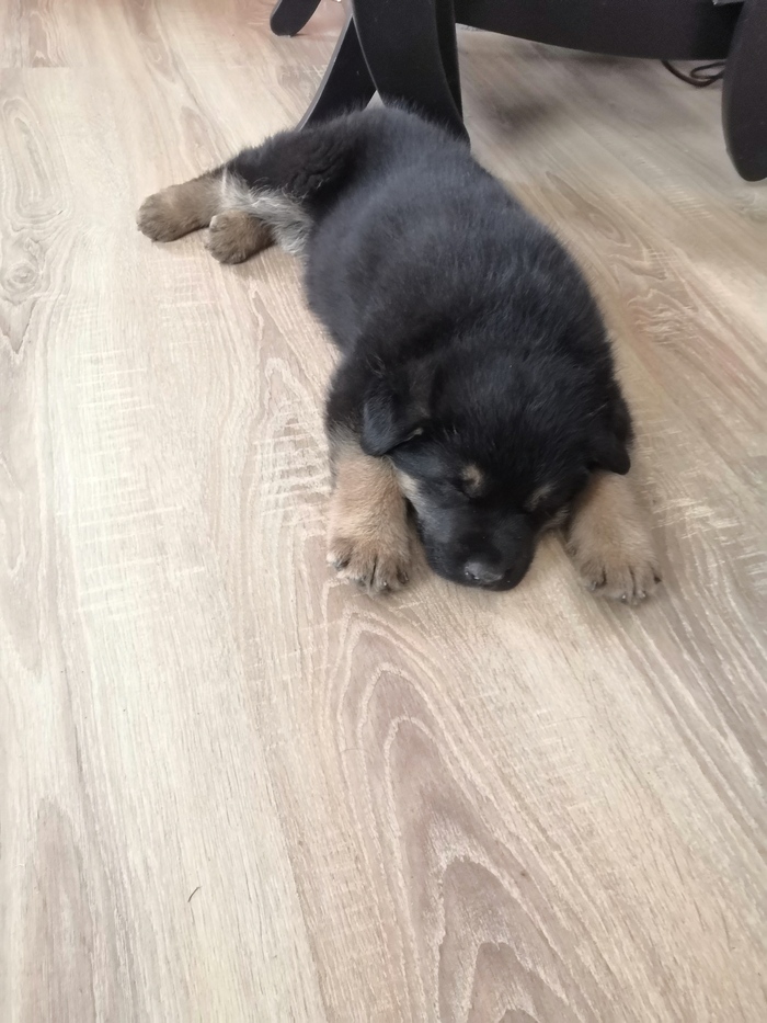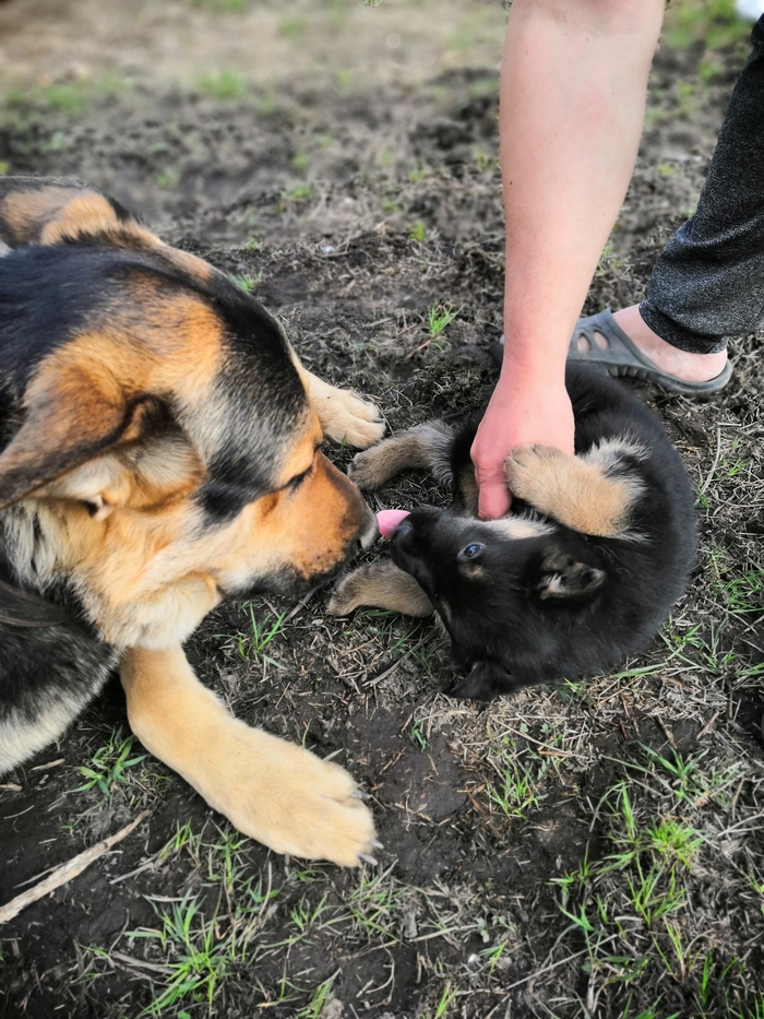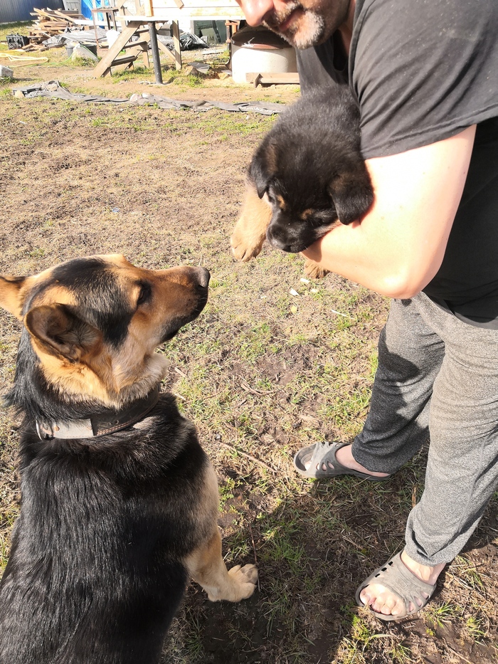Крепкий, здоровый малыш, весит 6 кг. Цезарь воспринял его хорошо, пытался играть сначала с ним, как со взрослым, пару раз сделал больно, не понимая своих и его габаритов. На второй день уже все хорошо, понял, как с ним надо обращатся, аккуратно обходит, переступает