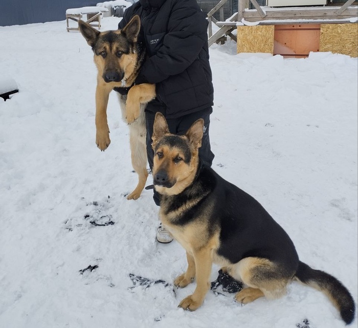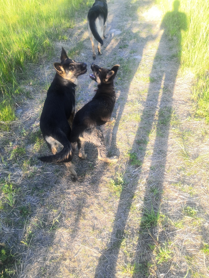 Ну вот и подрос малыш. Все прививки сделаны, можно выходить на прогулку и общаться с другими собаками. На одном из видео есть соседский щен немецкой овчарки, он чуть больше. Команды, которые Тайсон знает: ко мне, рядом, стоять (когда нужно остановиться), сидеть, фу, нет, ждать. Ему проще, потому как Цез все это делает, а он копирует. За еду душу продаст. Сырое мясо ест, по моему, не глотая. Пока Цезарь наклоняется за куском, Тайсон уже съел. Живут они дружно пока. Дальше только фото и видео, без комментов.