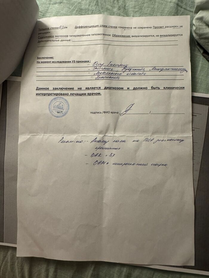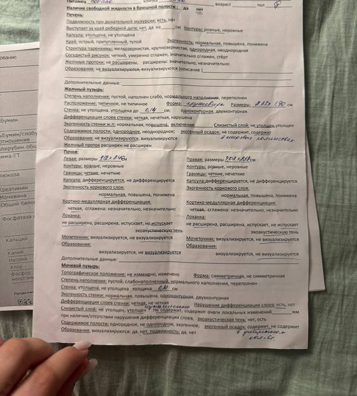 Но недавно, точно не помню когда, недели 2-3 назад ей опять стало плохо, она начала блевать желчью или пеной с прозрачной жидкостью, мы пошли к ветеринару. Сдали кал, мочу, кровь, делали узи жкт и до этого делали рентген