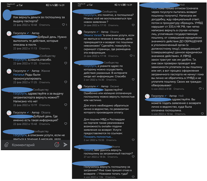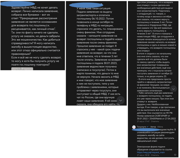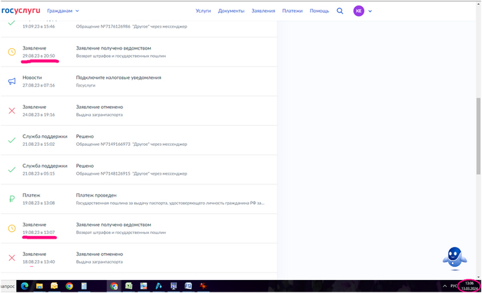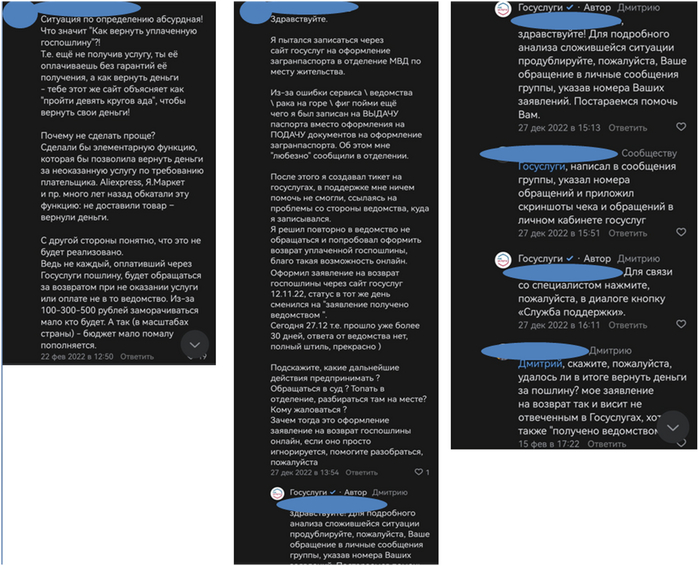 По итогу, услугу мне не оказали, деньги радостно были списаны за секунду, а вот теперь мне нужно доказывать, что я не жираф, чтобы вернуть свои кровно заработанные (с которых, кстати, мной ещё были уплачены налоги на содержание этих дармоедов). Да, я сама отменила заявления, но я бы не поступала так опрометчиво, если бы получила информацию в явном виде, что пошлину после подачи заявления я отменить не смогу. Но нет, на госуслугах радостно пестрила информация, что пошлину можно будет вернуть, и специалисты поддержки также неоднократно подтверждали данную информацию.