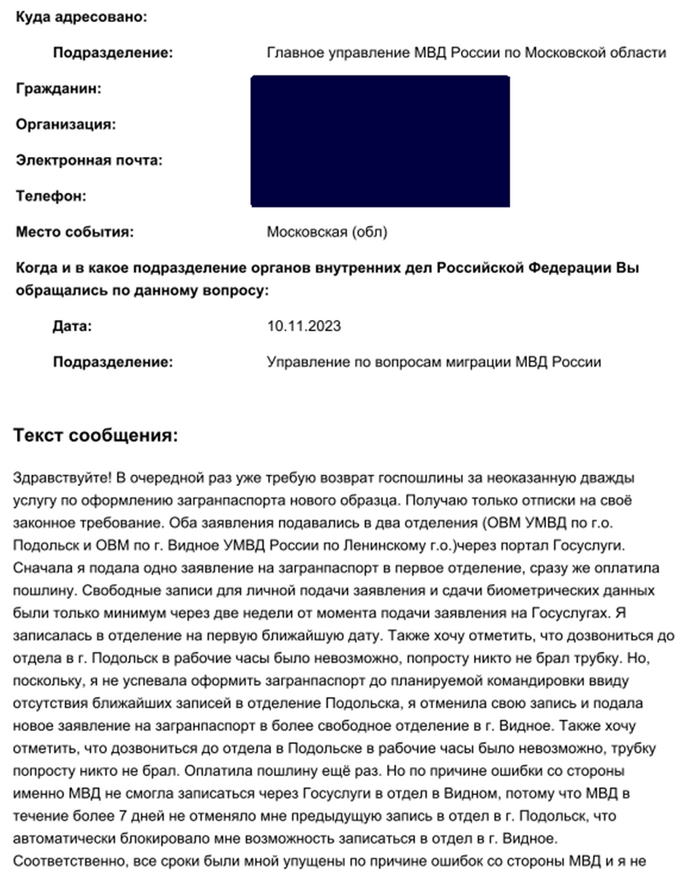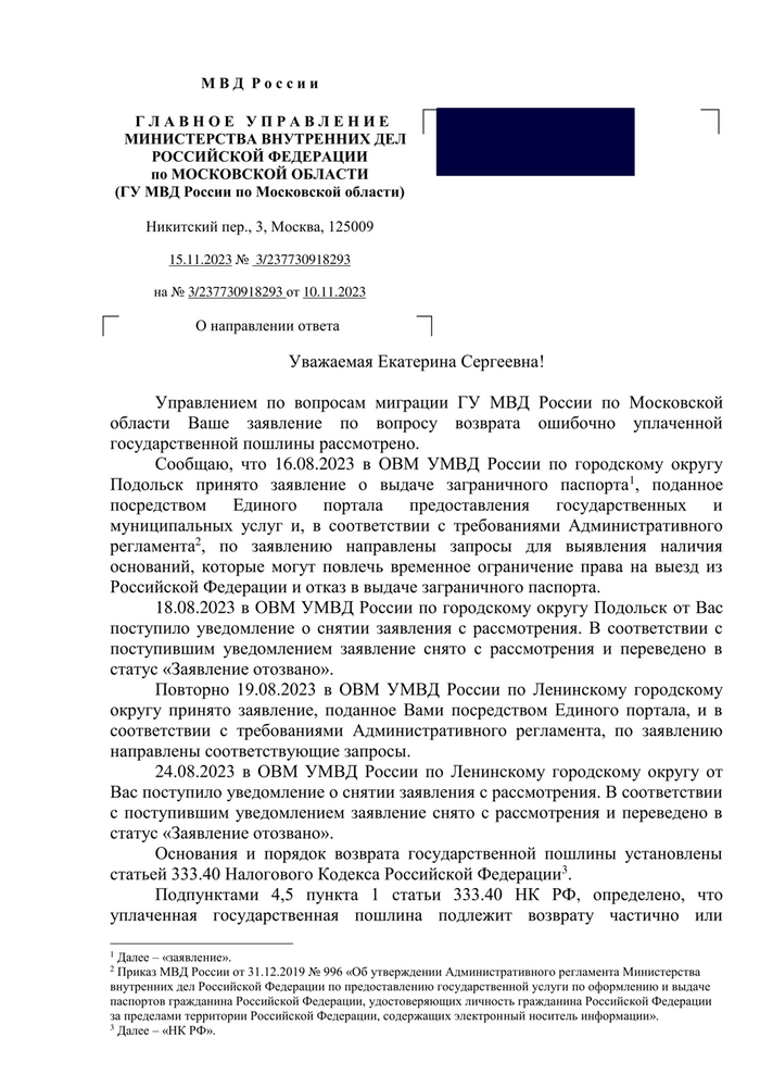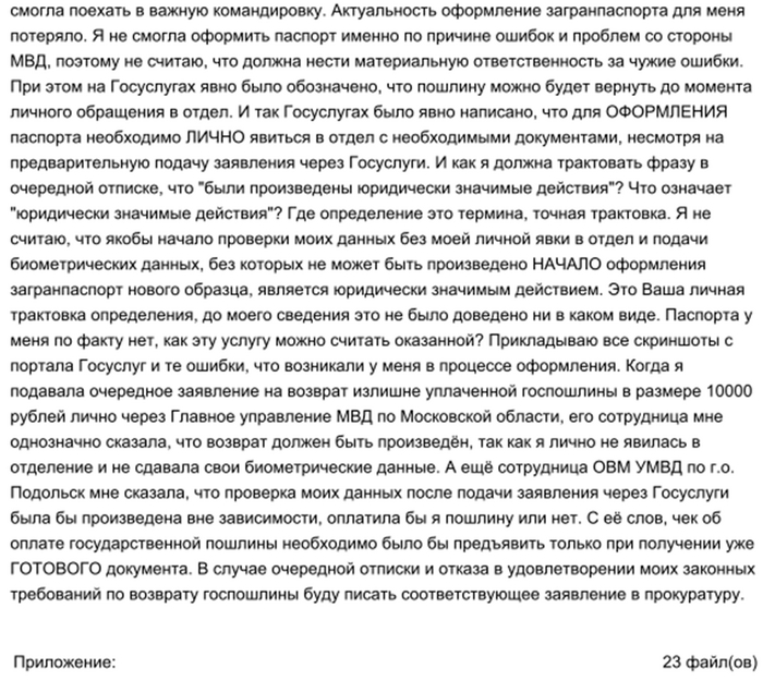 Госуслуги, которые должны, по идее, быть ответственны за взаимодействие гражданина с различными государственными ведомствами, умыли руки (они заявления в МВД отправили, а уж рассмотрели в МВД их в указанный 30-тидневный срок или нет, их это не волнует и повлиять они на это не могут, звоните и пишите сами). Окей, тогда я лично пришла в Подольский отдел писать заявление на возврат, на что мне сказали, что они такие заявления не принимают и вообще с госуслугами не работают (WTF?), идите туда, куда платили. И, вообще, они начали проверку (ой, наверное, уработались, прочитав в компуктере уже имеющиеся в базе мои данные), они выполнили обязательства, повторюсь, по услуге ОФОРМЛЕНИЯ, а не проверки моих данных. При этом же мне было сказано, что им вообще плевать, оплачена пошлина или нет, проверка была бы начата в любом случае, чек об оплате нужен будет только при получении паспорта (собственно, в назначении платежа написано, что пошлина оплачивается за ВЫДАЧУ паспорта, не за проверку моих документов). Штош, подала заявление на возврат через сайт самого МВД. На что получила глупую отписку (пруфы ниже). Они считают, что якобы начатая проверка по моему заявлению на паспорт через госуслуги, является юридически значимым действием, о чём вообще нигде не упоминалось ни в явном, ни в скрытом виде. И о том, что подача заявления через Госуслуги является юридически значимым действием, тоже нигде не указывалось. При этом, как я говорила выше, ОФОРМЛЕНИЕ, а я оплачивала пошлину за оформление загранпаспорта, начнётся только после ЛИЧНОЙ явки в отдел. Штош, я пошла писать заявление лично в Главное управление МВД по МО. Сотрудница управления сказала мне, что пошлины мне обязаны вернуть, так как я не сдавала биометрию и лично в отделение не явилась. Более того, она сказала, что это заявление ОБЯЗАН был принять отдел по вопросам миграции, в который я ранее обращалась за возвратом и действия его сотрудников были неправомерны. Но и на это заявление я вновь получила отказ с той же формулировкой, что и в предыдущем отказе.