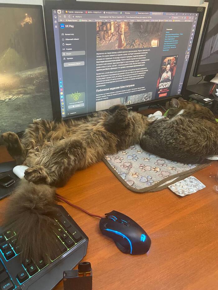 Сегодня у меня на столе случился настоящий драконский коллапс — Калесгос и Сенегос, словно два синих свитка, умудрились уместиться в пространстве, где обычно лежит только куча бумаг и чашка горячего чая. Размеры стола явно не соответствуют масштабам их величия, но, как ни странно, они нашли способ свернуться клубочком и устроить уютный послеобеденный дрых прямо на моём рабочем месте, явно не обошлось без магии...