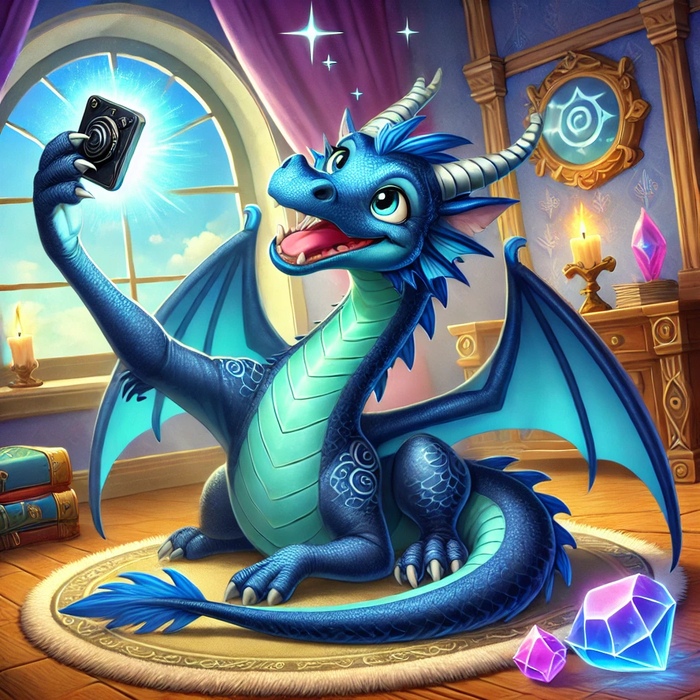 Дракон решил, что настало время увековечить своё благородное величие. Он грациозно улёгся на коврик, выгнув шею так, чтобы вся его блестящая чешуя ловила свет, и взгляд получился максимально драматичным. Голова оказалась повернута на 180 градусов — как у филина, только драконьего. Он щёлкнул СЕЛФИ-заклинание... и сработал эффект искажения.