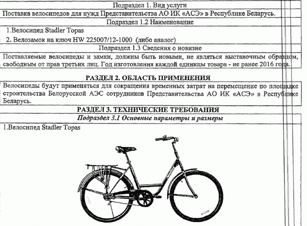 Для перемещения россиян по площадке, на которой строится Белорусская АЭС, покупают 30 велосипедов Stadler Topas. Информация об этом появилась на сайте государственных закупок. Там отмечается, что «велосипеды будут использоваться для сокращения временных затрат на перемещение на площадке строительства Белорусской АЭС» сотрудников Представительства российской инжиниринговой компании «АСЭ» в Беларуси, передает «Еврорадио».