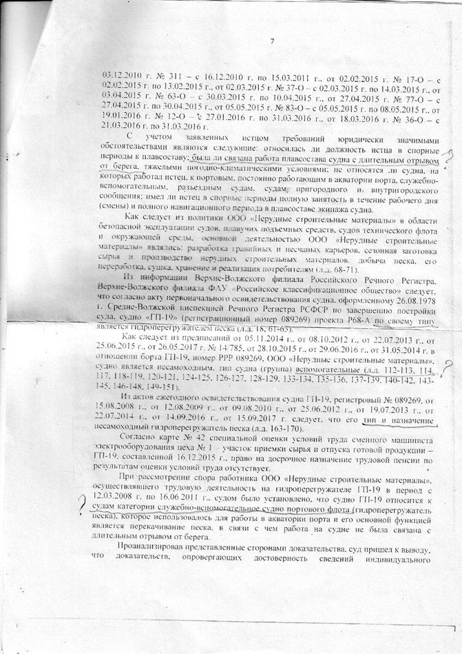 «… судом установлено, что судно ГП-19 относится к судам категории служебно-вспомогательное судно портового флота, которое использовалось в акватории порта и его основной функцией является перекачка песка, в связи с чем работа на судне не была связана с длительным отрывом от берега».